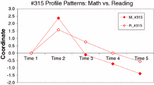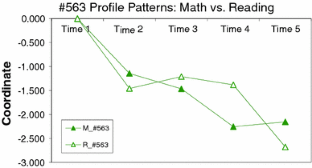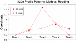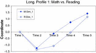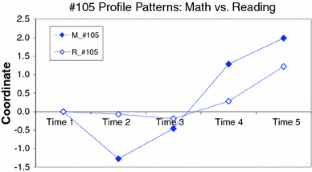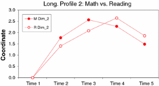 The aim of the study is to compare longitudinal patterns from Mathematics and Reading data from the direct child assessment of Early Child Longitudinal Study, Kindergarten (ECLS-K, US Department of Education, National Center for Education Statistics 2006), utilizing Profile Analysis via Multidimensional Scaling (PAMS). PAMS has been used initially to discover profile patterns in crosssectional data, and further applied to uncover longitudinal patterns by considering each time point as a coordinate of longitudinal patterns. The ECLS-K data analyzed here included longitudinal information about student achievement. The current study applied longitudinal PAMS to the data and examined how much the longitudinal patterns predict the fifth-grade achievement scores. Results showed that the longitudinal patterns that depicted the growing trend and the growing–decaying trend were significantly related to the fifth-grade achievement scores. Educational implications and discussions of longitudinal patterns were included.