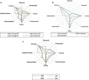 Note that the desirability directions of dimensions remain the same as before, i.e., an increase indicates an improvement in desirability of food system outcome for all dimensions except for the demand dimension, where an increase indicates higher stress to the food system.