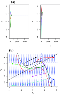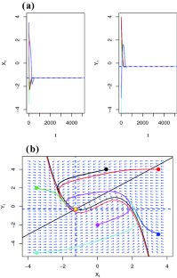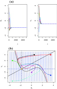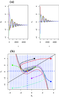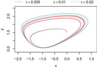 This figure shows the trajectory (red) of the CFHN model for parameters \(x_0=0, y_0=1, \epsilon =0.5, \gamma =0.5, a=1, I=1\), and \(T=25\). The green dashed lines represent the trajectories of the DFHN for the same parameters and for 100 values of \(\tau \), equally spaced between 0.005 and 0.3 (color figure online)