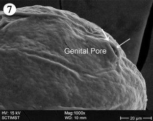 Echinorhynchus veli (George and Nadakal, 1978), an acanthocephalid worm infesting the estuarine flat fish, Synaptura orientalis, was collected from the Veli lake, Kerala. The parasite was recovered from the intestine of the host fish. The detailed surface morphology was studied with the help of scanning electron microscope. The study revealed a cylindrical, medially swollen proboscis with a flat apex, backward directed hooks, each with smooth surface, broad base, pointed tip and an epidermal elevation at the point of insertion. A pair of sensory pits was seen at the base of the proboscis. The neck was well developed with densely packed epidermal micropores. Paired sensory pits were seen at the base of the neck and a collar between it and the trunk. The epidermis of the trunk has microtriches and micropores. The female genital pore was circular, and terminal in an elevated orifice. In male, the copulatory bursa was directed ventrally, with well-defined rim and several sensory papillae.