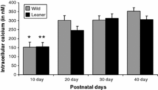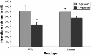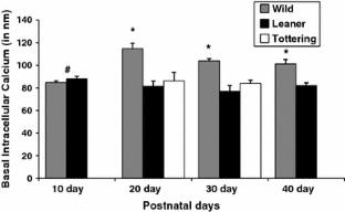 Maintaining calcium ion (Ca2+) homeostasis is crucial for normal neuronal function. Altered Ca2+ homeostasis interferes with Ca2+ signaling processes and affects neuronal survival. In this study, we used homozygous leaner and tottering mutant mice, which carry autosomal recessive mutations in the gene coding for the α1A pore forming subunit of CaV2.1 (P/Q-type) voltage-gated calcium channels (VGCC). Leaner mice show severe ataxia and epilepsy, while tottering mice are less severely affected. Leaner cerebellar granule cells (CGC) show extensive apoptotic cell death that peaks at postnatal (P) day 20 and continues into adulthood. Intracellular Ca2+ ([Ca2+]i) concentrations in leaner and tottering mouse Purkinje cells have been described, but [Ca2+]i concentrations have not been reported for granule cells, the largest neuronal population of the cerebellum. Using the ratiometric dye, Fura-2 AM, we investigated the role of Ca2+ homeostasis in CGC death during postnatal development by demonstrating basal [Ca2+]i, depolarization induced Ca2+ transients, and Ca2+ transients after completely blocking CaV2.1 VGCC. From P20 onward, basal [Ca2+]i levels in leaner CGC were significantly lower compared to age-matched wild-type CGC. We also compared basal [Ca2+]i levels in leaner and wild-type CGC to basal [Ca2+]i in tottering CGC. Potassium chloride induced depolarization revealed no significant difference in Ca2+ transients between leaner and wild-type CGC, indicating that even though leaner CGC have dysfunctional P/Q-type VGCC, Ca2+ transients after depolarization are the same. This suggests that other VGCC are compensating for the dysfunctional P/Q channels. This finding was further confirmed by completely blocking CaV2.1 VGCC using ω-Agatoxin IV-A.