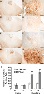 Reinforcing effects of addictive drugs can be evaluated with the conditioned place preference (CPP) test which involves both the action of drugs and environmental cues. However, the encoded neural circuits and underlying signaling mechanism are not fully understood. In this study, we have used morphine-CPP model in the rat and characterized the role of N-methyl-d-aspartate (NMDA) receptor and the phosphorylation of extracellular signal-regulated kinase (ERK) in the central nuclei of amygdala (CeA) in the expression of morphine-induced CPP. We have found that morphine repeated pairing treatment causes a significant preference for compartment paired with morphine after 1 day or 7 days post-training, which is associated with increased ERK1/2 phosphorylation (p-ERK1/2, a measure of ERK activity) in the CeA. More than 80% of the positive p-ERK1/2 neurons express NMDA receptor subunit NR1 by double immunofluorescence studies. The infusion of either MEK inhibitor U0126 or NMDA receptor antagonist MK-801 in the CeA not only suppresses the activation of ERK1/2 in the CeA but also abolishes the expression of CPP. These results suggest that the activation of the NMDA receptor–ERK signaling pathway in the CeA is required for the expression of morphine-induced place preference in the rat.