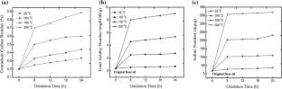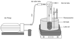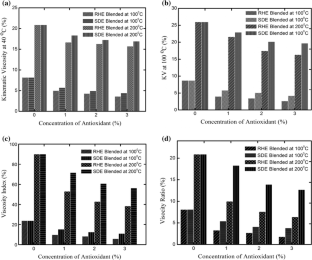 The thermo-oxidative stability of the mineral base oil (MBO) was examined by subjecting it to artificial aging process performed at different temperatures (25, 50, 100, 150, and 200 °C) and times (00–24 h in cycles of 06 h). The MBO samples additized with the antioxidants under study were then oxidized under the optimized temperatures and time. The antioxidants were used in concentration range of 1–3 % (w/w). The extent of the degradation was estimated from the changes in the physico-chemical properties i.e. kinematic viscosity determined at 40 and 100 °C, viscosity index, viscosity ratio, Conradson carbon residue, total acid number and iodine number in comparison with the un-oxidized plain oil. The results inferred that the antioxidants used in concentration of 3 % proved to be effective in avoiding the thermo-oxidative degradation of the MBO.
