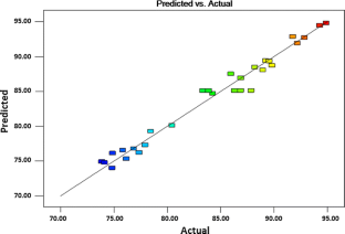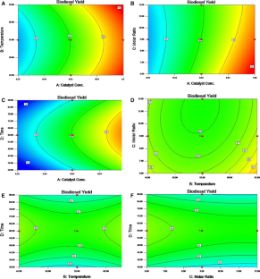 The aim of this study was to use the under-utilized vegetable seed oil and produce high and better yield of biodiesel. The response surface methodology (RSM) was used, based on central composite rotatable design (CCRD), to optimize four trans-esterification reaction variables for getting high yield: catalyst concentration (CC; 0.25–1.0 %), reaction temperature (RT; 45–65 °C), CH3OH-to-oil molar ratio (6:1–12:1) and reaction time (30–90 min). The 24 full factorial CCRD design was applied, using four different parameters at five levels, each lead to 30 experiments to produce Pongamia pinnata oil-methyl esters (POMEs). The molar ratio of CH3OH to oil and RT were the most significant (p < 0.01) factors affecting the yield of POMEs. A linear relationship was recorded between the observed and predicted values (R 2 = 0.9744). Using multiple regression analysis a quadratic polynomial equation was recognized for methyl ester yield (MEY). The quadratic term of CC showed a significant (p < 0.0001) impact on esters yield. The interaction terms of CH3OH to oil molar ratio and CC with reaction time exhibited a +ve effect on the MEY (p < 0.05). The optimum reaction conditions for trans-esterification of oils were 6.1 CH3OH to oil ratio, 1.0 % CC, 65 °C RT and 1:30 h reaction time, resulting in Pongamia oil MEY of 94.88 %. The RSM was found to be a suitable technique for optimizing trans-esterification process and produced fuel was within the ranges of ASTM D6751 and EN 14214 standards.