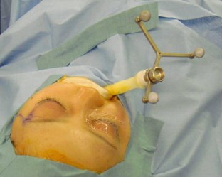 When prepping for navigation surgery, a reference frame must be fixed to the patient’s head with a Mayfield clamp, bone anchor, headset, or headband. Fixation of the clamp or bone anchor with a screw or head pins is invasive, whereas use of a headband or headset is noninvasive. However, during orbital surgery for blowout fractures or orbital tumors, surgeons or instruments can interfere between the reference frame and the optical tracking navigation system, even if using noninvasive fixation.