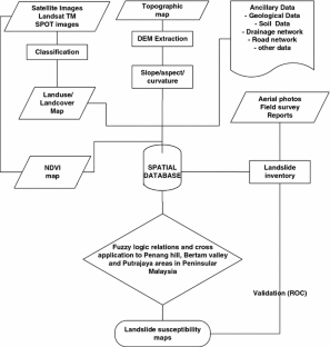 Landslides are one of the most frequent and common natural hazards in Malaysia. Preparation of landslide susceptibility maps is one of the first and most important steps in the landslide hazard mitigation. However, due to complex nature of landslides, producing a reliable susceptibility map is not easy. For this reason, a number of different approaches have been used, including direct and indirect heuristic approaches, deterministic, probabilistic, statistical, and data mining approaches. Moreover, these landslides can be systematically assessed and mapped through a traditional mapping framework using geoinformation technologies. Since the early 1990s, several mathematical models have been developed and applied to landslide hazard mapping using geographic information system (GIS). Among various approaches, fuzzy logic relation for mapping landslide susceptibility is one of the techniques that allows to describe the role of each predisposing factor (landslide-conditioning parameters) and their optimal combination. This paper presents a new attempt at landslide susceptibility mapping using fuzzy logic relations and their cross application of membership values to three study areas in Malaysia using a GIS. The possibility of capturing the judgment and the modeling of conditioning factors are the main advantages of using fuzzy logic. These models are capable to capture the conditioning factors directly affecting the landslides and also the inter-relationship among them. In the first stage of the study, a landslide inventory was complied for each of the three study areas using both field surveys and airphoto studies. Using total 12 topographic and lithological variables, landslide susceptibility models were developed using the fuzzy logic approach. Then the landslide inventory and the parameter maps were analyzed together using the fuzzy relations and the landslide susceptibility maps produced. Finally, the prediction performance of the susceptibility maps was checked by considering field-verified landslide locations in the studied areas. Further, the susceptibility maps were validated using the receiver-operating characteristics (ROC) success rate curves. The ROC curve technique is based on plotting model sensitivity—true positive fraction values calculated for different threshold values versus model specificity—true negative fraction values on a graph. The ROC curves were calculated for the landslide susceptibility maps obtained from the application and cross application of fuzzy logic relations. Qualitatively, the produced landslide susceptibility maps showed greater than 82% landslide susceptibility in all nine cases. The results indicated that, when compared with the landslide susceptibility maps, the landslides identified in the study areas were found to be located in the very high and high susceptibility zones. This shows that as far as the performance of the fuzzy logic relation approach is concerned, the results appeared to be quite satisfactory, the zones determined on the map being zones of relative susceptibility.