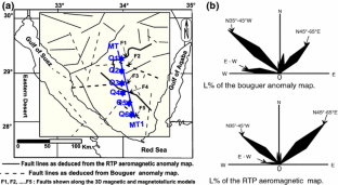 In this work, an integrated study was carried out to delineate the prevailing subsurface fault structures and their tectonic position in the southern part of the Sinai Peninsula. The study area is selected due to its active tectonic situation. This study is implemented using the available geophysical data; these include magnetic, Bouguer gravity, seismic data to trace the delineated fault structures in shallow subsurface and magnetotelluric data to trace down these structures at deeper depths. To achieve this goal, several techniques have been applied in the interpretation of the data including least squares, trend analysis, Euler deconvolution, 3-D modeling and analytical signal techniques. The results indicate that the main fault structural trends are N 35°–45° W, N 15°–25° E and E–W directions, in accordance with the regional tectonics of the Gulf of Suez rift and Gulf of Aqaba, transform as well as the Tethyan tectonics. The depths to the basement rocks are widely varying from 0 km to about 4 kms. Two seismic lines (EG 31 and MP-70), compiled by Egyptian General Petroleum Cooperation, have been interpreted as well as a geologic cross section derived from well-logging data. The results illustrate that the study area has been affected by the fault structures prevailing there and affecting the rock units and dividing them into several major blocks. The results obtained from 2-D inversions of magnetotelluric soundings show that the fault structures that have E–W trends extend to deeper depths than faults which have N35°–45°W, N15°–25°E.