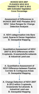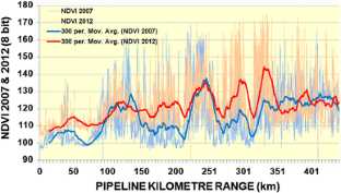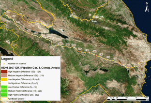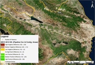 The main goal of this research was to perform vegetation cover restoration and soil erosion risk assessment based on multi-temporal NDVI monitoring and deterministic USLE erosion prediction model along Baku–Tbilisi–Ceyhan Oil and South Caucasus Gas pipelines. The categorization of NDVI derived from IKONOS 2007 and PLEIADES 2012 high-resolution multispectral satellite images into the bare lands, sparse and dense vegetation revealed the positive vegetation cover restoration along oil and gas pipelines. The change detection analysis of NDVIs showed that the class of ‘Significant Increase in Vegetation’ was 5.40 km2 within the croplands. However, the classes of ‘Significant Decrease in Vegetation’ and ‘No Significant Change in Vegetation’ were observed to be 2.56 and 5.10 km2 within croplands, correspondingly. This decrease can be explained by the encumbrances applied for the partial restrictions of land-use activities along oil and gas pipelines to mitigate potential risks to pipelines and by the slow natural vegetation restoration. NDVI analysis for 50-m section polygons of pipeline corridor and contiguous areas showed that 7072 polygons had no significant NDVI difference in 2012, whereas in 2007 it was 4383. USLE model run with cover-management factor derived from PLEIADES NDVI 2012 showed higher number of polygons with predicted erosion class of ‘0–10 ton/ha’ which is acceptable and not critical to pipelines. For higher erosion classes more than ‘0–10 ton/ha’, USLE model run with IKONOS NDVI 2007 revealed higher number of polygons. USLE model run predicted 37 % of total number of erosion occurrences identified during 2005–2014.