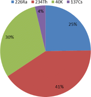 The present study aims to obtain the baseline data on natural and fallout radioactivity and to evaluate radiation hazards caused by ionizing radiation emitted from 226Ra, 232Th, 222Rn, 40K and 137Cs in surface soil samples collected from Mersin province and Akkuyu nuclear power plant region. The activity concentrations of 226Ra, 232Th, 40K and 137Cs were measured using a gamma spectrometer with HPGe detector. The activity concentrations of 226Ra, 232Th, 40K and 137Cs varied from 14.1 ± 0.7 to 65.4 ± 2.9, 12.0 ± 0.8–51.7 ± 2.1, 172.2 ± 15.8–511.1 ± 37.8 and <MDA to 86.2 ± 1.4 Bq kg−1, respectively. The average concentrations of radon in soil and air were estimated as 23.9 kBq m−3 and 76 Bq m−3. The radiological parameters such as absorbed gamma dose rate in outdoor air (DRout), annual effective dose rate from external exposure (E Ext), annual effective dose rate from inhalation of radon (E Inh) and lifetime cancer risk (LTCR) were calculated to evaluate radiological hazards. The average values of DRout, E Ext, E Inh and LTCR were found to be 51 nGy h−1, 62 μSv year−1, 715 μSv year−1 and 2.2 × 10−4, respectively.
