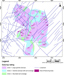 The exploitation of granite resources and the consequent processing create several economic opportunities that provide the creation of infrastructures and services. This flourishing activity is based on the available resources which need to be identified and protected through an effective land use planning. In this study, the evaluation of the granite resources in an exploitation area was performed. The fracturing and the quality of the outcrops are fundamental factors to be considered during ornamental stone exploration, but for the evaluation of the available resources, land use planning constraints should be considered. All the collected data were processed in a geographic information system to determine the potential extractive areas. Considering the several limitations, namely active quarries and legal constraints, only 41.3% of the study area can be used for installing new quarries. Considering the fracturing limitations, these new quarries, with a mean depth and mean deposit yield of 12.5 m and 12.5%, respectively, will supply about 2.67 × 106 m3 of granite. The results highlight the importance of an integrated evaluation of the natural stone resources since large areas not necessarily mean abundant resources.