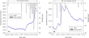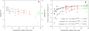 Based on the well-delineated groundwater potentiometric map, the groundwater flow rate can be quantitatively calculated by the Darcy’s equation (VD = k(H0 − HL)/L) when it flows in a distance L with hydraulic potential decrease of (H0 − HL). As a result, the groundwater residence time of each sampling sites was calculated and shown in Fig. 14.