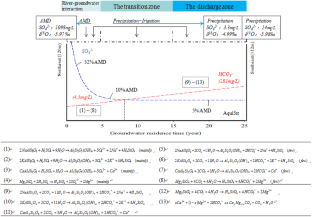 Investigations were undertaken in the riparian zone near Shangba village, an AMD area, in southern China to determine the effects that river–groundwater interactions and groundwater residence time have had on environmental quality and geochemical evolution of groundwater. Based on the Darcy’s law and ionic mass balances as well as the method of isotopic tracer, the results showed that there were active interactions between AMD-contaminated river water and groundwater in the riparian zone in the study area. River water was found to be the main source of groundwater recharge in the northwestern part of the study area, whereas groundwater was found to be discharging into the river in the southeastern part of the study area throughout the year. End-member mixing analysis quantified that the contributions of river water to groundwater decreased gradually from 35.9% to negligible levels along the flow path. The calculated mixing concentrations of major ions indicated that water–rock reactions were the most important influence on groundwater quality. The wide range of Ca2+ + Mg2+ and HCO3− ratios and the change of groundwater type from Ca2+–SO42− type to a chemical composition dominated by Ca2+–HCO3− type indicated a change of the major water–rock reaction process from the influence of H2SO4 (AMD) to that of CO2 (soil respiration) along a groundwater flow path. Furthermore, the kinetics interpretation of SO42− and HCO3− concentrations suggested that the overlapping time of their kinetics triggered the hydrochemical evolution and the change of major weathering agent. This process might take approximately 8 years and this kinetic time will be continued when a steady source of contamination enter the aquifer.