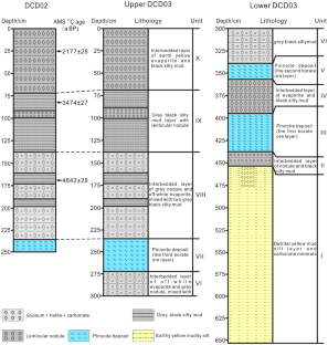 Da Qaidam Salt Lake, northern Qaidam Basin, is known for its liquid and solid boron resource. More than that, pinnoite-bearing sediments, occurring in this lake, are rare in the world. However, little attention has been paid to the hydro-climate change and brine evolution correlation with the formation of pinnoite deposit. According to the multi-proxy records, as well as AMS 14C dating, the sediment profiles DCD02 and DCD03 from Da Qaidam Salt Lake were studied. The results revealed that the ore-forming age of three pinnoite deposits are 7.83–8.62 cal ka BP, 6.74–7.07 cal ka BP and 4.66–5.41 cal ka BP. The sedimentary evolution of Da Qaidam Salt Lake along with the pinnoite formation during the past 13,000 years can be divided into four stages, i.e., (1) relatively fresh and deep paleo-lake with low salinity during 12.98–9.00 cal ka BP; (2) seasonal variations between fresh and brackish paleo-lake during 9.00–8.62 cal ka BP; (3) salt lake stage with relatively high salinity and alkalinity during 8.62–4.66 cal ka BP, and (4) relatively shallow lake with high salinity since 4.66 cal ka BP. Under favorable sedimentologic and hydrogeochemical conditions, a series of boron deposits including pinnoite ore formed in different zones of Da Qaidam Salt Lake due to the different ore-forming mechanisms. Finally, under the differential effect of climate warming condition between the high mountain catchments and arid basin, the boron ore-forming model was established as a higher mountain–lower basin–shallower water model.