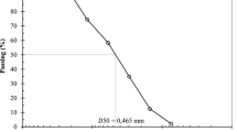 According to the criterion for assessing mineral soils based on their coefficients of uniformity and curvature, the tested fly ash classifies as a material that responds poorly to compaction, because its CU is 4.00 and CC—1.26. The unit weight (γs) obtained for an average sample was 20.5 kN/m3. The specific surface of tested fly ash, measured by the methylene blue spot test, was 21.01 m2/g. This value is comparable to the specific surface of kaolinite (Santamarina et al. 2002). It should be noted that fly ash is fine non-plastic material. It consists of silt-sized particles and is characterised by kaolinite-like specific surface, but a fly ash thread cannot be rolled out down to about 3 mm at any moisture possible.