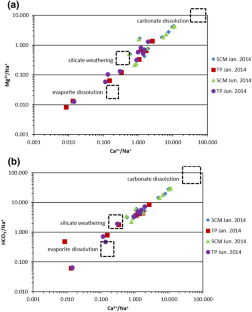 Supplementary file4 Fig. S4. Piper plot showing major-ion compositions. Red and blue denote water samples collected in January and June 2014, respectively. Symbols: triangle = Sri Chiang Mai site groundwater; clover = That Phanom groundwater; square = Sri Chiang Mai river water; circle = That Phanom river water (TIF 3940 KB)