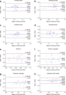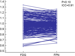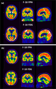 A total of 29 subjects (15 HC and 14 AD subjects) underwent F-18 FPN PET and F-18 FDG PET. F-18 FDG PET image was acquired from 30 to 60 min and F-18 FPN PET for 0 to 10 min. F-18 FPN and F-18 FDG images were spatially normalized with transformation matrices obtained from individual CT images and standardized uptake value ration (SUVR) from cerebellum area, and the global mean was calculated using PMOD 3.6. Pearson’s correlation coefficients between F-18 FDG and early F-18 FPN for predefined cortical brain regions were calculated.