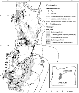 Montane fens are biologically diverse peat-forming wetlands that develop at points of groundwater discharge. To protect these ecosystems, it is critical to understand their locations on the landscape and the hydrogeologic systems that support them. The upper Deschutes Basin has a groundwater flow system that supports baseflow in many rivers, but little is known about the wetland types and groundwater dependence of the thousands of wetlands within the watershed. In 292 randomly selected wetlands, we quantified landscape metrics thought useful for discriminating montane fens from non-peat-forming wetlands. We inspected these wetlands and classified 67 of them as fens. Of the landscape metrics, only geology reliably differentiated fens from other types of wetlands. Nearly all fens develop in low-permeability glacial till found at approximately 1400–1800 m in elevation, and are concentrated in areas mantled by pumice deposits that originated primarily from the eruption of Mt. Mazama approximately 7700 years BP. Stratigraphic and hydrologic factors indicate the fens are supplied by perched aquifers in glacial till, instead of the deeper regional aquifer system. Their hydrogeologic setting makes the fens highly vulnerable to expected changes to recharge associated with climate change, but not to groundwater pumping from the regional aquifer.