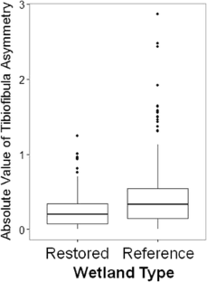 Environmental and amphibian characteristics of restored and reference wetlands in central Iowa. Where differences between years were not significant, the means of the pooled 2012 and 2013 data are shown. Fluctuating asymmetry is the absolute value of the difference between mean measurements for right and left tibiofibulae. Abbreviations: Batrachochytrium dendrobatidis (Bd); not detected (ND); not sampled; (--); leopard frog (LIPI); and fluctuating asymmetry (FA). (DOC 51 kb)