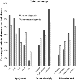 With trends toward increasing patient involvement in medical decision-making, decreasing clinic times, and the availability of the Internet, patients and their caregivers are increasingly researching cancer diagnoses online. It is essential for physicians to understand patient Internet usage as it relates to their own health education. Internet usage trends have been studied in various areas, but not in thoracic diseases. This prospective cohort study surveyed 337 thoracic surgery patients and their caregivers with both cancer and non-cancer diagnoses to examine their Internet usage trends. Cancer subjects were more likely to research their condition online if they were younger, had a higher income, had a higher education level, and were currently employed. Only age and income level were predictive for non-cancer subjects. Separately, cancer subjects were more likely to trust information found on the Internet if they had a higher education. Subjects were most likely to conduct research on a hospital website than other websites. These data will be helpful to thoracic surgeons who want to appropriately educate patients and their caregivers and direct them to reliable Internet sources. These data also illustrate the importance of developing trustworthy hospital websites with disease-specific information.
