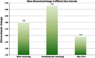 Impressions are important sources of cross contamination between patients and dental laboratories. As a part of infection control impressions contaminated with variety of micro-organisms via blood and oral secretions should be cleaned and disinfected or sterilized before being handled in dental laboratory. The purpose of this study was to determine the effect of autoclaving on dimensional stability of elastomeric impression material (polyvinyl siloxane—Affinis). In this in vitro study standardized stainless steel die as per ADA specification number 19 was fabricated. Polyvinyl siloxane (Affinis) light body and putty viscosity elastomeric impression materials were used. A total of 40 impressions of the stainless steel die were made and numeric coding system was used to identify the samples. Measurements were made using a measuring microscope. Distance between the cross lines CD and C′D′ reproduced in the impression were measured before autoclaving, immediately after autoclaving and 24 hours after autoclaving and dimensional change was calculated. The data obtained was subjected to statistical analysis. The mean difference in dimensional change between the three groups was not statistically significant (P > 0.05). However the results revealed that there was higher mean dimensional change immediately after autoclaving when compared to the other 2 time intervals. It is desirable to delay the casting of an autoclavable elastomeric impression material by about 24 hours. Though disinfection of impression is routinely followed autoclaving of impression is an effective method of sterilization.