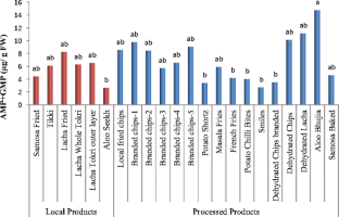 Market for processed potato products is rising day by day. Flavour plays important role in decision making by consumers due to their preferences for better tasting food. In potato and potato products, glutamic acid, aspartic acid, guanosine 5′-monophosphate (GMP) and adenosine 5′-monophosphate (AMP) are the major umami compounds which contribute towards flavour. Therefore, umami 5′ nucleotides (AMP+GMP) were estimated from local potato products available as common fried products in the Indian markets and processed potato products being sold by the retailers. The analysis was also carried in raw, microwaved and pressure cooked tubers of forty seven Indian potato cultivars. Umami 5′ nucleotide content ranged from 2.63 (Aloo seekh) to 8.26 μg/g FW (fried lachcha) in local potato products. In processed potato products, the content ranged from 2.72 μg/g FW (Smiles) to 14.75 μg/g FW (Aloo Bhujia). Along with aloo bhujia, umami 5′ nucleotides were also high in dehydrated aloo lachcha (11.14 μg/g FW) and dehydrated potato chips (10.13 μg/g FW) and low in Smiles (2.72 μg/g FW) and Potato Shortz (3.40 μg/g FW). The study suggests that the potato products prepared solely from potato contained higher levels of umami 5′ nucleotides compared to other products prepared by mixing potato with other cereals and vegetables. In Indian potato cultivars overall there was 14 % increase on microwave cooking and 31 % increase in flavouring compounds on pressure cooking. This type of study enabled in identifying better tasting cultivars for further product development and also to develop products with less addition of salt.
