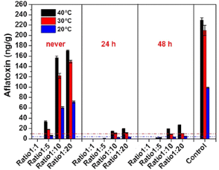 The ability of superabsorbent polymers (SAP) in drying maize and controlling aflatoxin contamination was studied under different temperatures, drying times and SAP-to-maize ratios. Temperature and drying time showed significant influence on the aflatoxin formation. SAP-to-maize ratios between 1:1 and 1:5 showed little or no aflatoxin contamination after drying to the optimal moisture content (MC) of 13 %, while for ratios 1:10 and 1:20, aflatoxin contamination was not well controlled due to the overall higher MC and drying time, which made these ratios unsuitable for the drying process. Results clearly show that temperature, frequency of SAP change, drying time and SAP-to-maize ratio influenced the drying rate and aflatoxin contamination. Furthermore, it was shown that SAP had good potential for grain drying and can be used iteratively, which can make this system an optimal solution to reduce aflatoxin contamination in maize, particular for developing countries and resource-lacking areas.