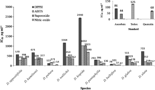 Modern research is directed towards finding naturally-occurring antioxidants of plant origin for improving nutrition and health benefit. Wild yam species are used as indigenous food and medicine by various tribal groups of Koraput, India. However, detailed analysis of health promoting bioactive compounds and antioxidant properties are lacking. The present study aims to evaluate the flavonoid, total antioxidant capacity and in vitro antioxidant activity of different wild and cultivated Dioscorea species of Koraput. The extract of these tuber was screened for its potential antioxidant activities by various tests, such as DPPH, nitric oxide, superoxide and ABTS radical cation assay. The phenol, flavonoid and total antioxidant capacity of the samples were ranged from 2.19 to 9.62 mg g−1 dry weight, 0.62–0.85 mg g−1 dry weight and 1.63–5.59%, respectively. The IC50 values were 77.9–1164, 101.2–1031.6, 27.0–1022.6 and 47.1–690 µg ml−1 for DPPH, ABTS, superoxide and nitric oxide scavenging activity, respectively. Taken together, some wild yam species such as D. bulbifera, D. pubera and D. pentaphylla had significantly higher flavonoids content and antioxidant capacity along with the lower IC50 values than the standards in compared to the other species. The present studies confirmed that some wild yam tubers have superior potential for scavenging deleterious free radicals effectively. Results indicated that these wild yam species should be promoted as natural source of antioxidants.