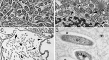a–d. Root tissues and bacteria stained with SYTO9 florescent nucleic acid stain. a and b Root hairs showing epiphytic swollen oxidizing bacteria (arrows) with intact bacteria in background; c Root parenchyma showing intensely staining intact bacteria (yellow arrows) and masses of oxidizing bacteria (blue arrow); d Root parenchyma showing nucleic acid rings (bulls-eye rings) around oxidizing bacteria (arrows)