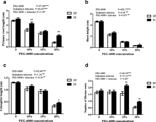 Some Epichloë species are beneficial to their plant hosts by improving fitness and resistance to stress. The natural, seedborne, asymptomatic symbiotic endophyte Epichloë sinica is specific for Roegneria spp., which are perennial grasses found in grasslands or meadows; many species of Roegneria are excellent forage plants. This study was designed to reveal the biological function of E. sinica via seedling assays with drought simulation using polyethylene glycol (PEG)-6000. Endophyte infected (EI) and endophyte free (EF) R. kamoji seeds (obtained by heat treatment) were germinated and grown on 0, 10, 15 and 20% PEG-6000 for 10 days; seedling and root system morphologies were investigated, and reactive oxygen species (ROS), which act as signaling molecules in plant responses to abiotic stress, were detected. E. sinica enhanced both the germination potential and rate of R. kamoji seeds treated with high concentrations of PEG-6000. After PEG treatment, shoot and root morphologies differed significantly between EF and EI seedlings. Additionally, lower amounts of ROS concentration were detected in the leaves of EI seedlings treated with high concentrations of PEG-6000. In conclusion, E. sinica promoted PEG-6000 simulated drought stress resistance in R. kamoji seedlings.