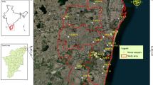 Chennai is the capital of Tamil Nadu State and is located on the Coromandel Coast of the Bay of Bengal between 13.04°N and longitude 80.17°E (Fig. 1). The city covers an area of 174 km2. The rainfall in the study area is chiefly controlled by the northeastern monsoon (October, November and December) with an average annual rainfall of 1,200 mm. The study area enjoys a tropical climate with a mean annual temperature and humidity of 24.3–32.9 °C and 65–84 %, respectively. The humidity is usually in the range of 65–84 %. A major part of the study area has flat topography with very gentle slope towards east. The coastal aquifers are underlain by various geological formations from ancient Archaean to Recent alluvium. The alluvium covers the major part of the study area, which consists of sand, silts and clays. The thickness of alluvium varies from place to place to a maximum of 28 m.