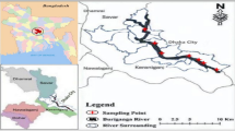 The river Buriganga is situated at the southern part Dhaka City, the capital of Bangladesh. Geographically, it is located altitude between 23° 36′ E and 23° 46′ E, with longitude between 90° 14′ N and 90° 36′ N (see Fig. 1). This river is originated as a result of confluence of the river Padma (Ganges) and the river Dhaleswari, which, is a distributary, 160 km long of the Jamuna River in central Bangladesh. The Lakhya River is combined to the Dhaleswari, approximately 11 km downstream of the Buriganga confluence, which is then merged into the Meghna River, just upstream of the Padma confluence near Chandpur. The Buriganga takes stream mainly from the river Turag, which receives spill flows from the river Jamuna and local rain fall. The lower reaches of the Buriganga–Dhaleswari–Lakhya river system are tidal during the dry season (November–March) when upstream inflows are nominal (Kamal et al. 1999). The average width and depth of the river Buriganga are 400 m and 10 m, respectively. This river is only 27 km long. The sampling was performed from 10 major points of the river. The samples were also collected from two rivers named Surma and Dawki. Both of these rivers are located in the north-eastern region of Bangladesh which carry flows due to rain fall in the Meghalaya, India, which is known as the most rainy region over the glove where the annual rainfall is even up to 23,000 mm (Soja and Starkel 2007). Therefore, the waters of these rivers are fresh and clean, which are ideal for any reference of study in terms of purity.