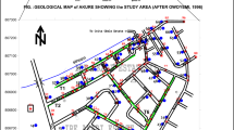 The study area lies between latitudes 08° 24.50′ N and 08° 27.99′ N of the equator and longitudes 04° 27.50′ E and 04° 41.00′ E of the Greenwich Meridian (Fig. 1a, b). The area covers about 161 square kilometers in Ilorin South Local Government of Kwara State and falls within Geological Sheet Ilorin 223 of the Nigerian Geological Survey Agency. The study area is part of the Savana region of Nigeria, has two main seasons—rain season and dry season. The mean annual rainfall and temperature range from 75 to 112 mm and 27 and 35 °C. Drainage is provide by River Asa, River Oyun, their tributaries and distributaries. The mean daily sun shine is about 8 hours. Geologically, the study area falls within the Precambrian basement terrain of the southwestern Nigeria considered to be Precambrian to lower Paleozoic in age (Oyawoye 1964; Rahaman 1976; Annor et al. 1987). The rock comprised mostly gneiss, granite, schist, and undifferentiated meta-sediment. In the study area, the rocks outcrop in some places and are covered by weathered rock and topsoil in many places. The rocks are well exposed along river channels.