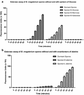 The present study was undertaken with the objective to assess the effect of distinct stereoisomeric forms of nutrient germinants (selected sugars and amino acids) on the process of germination onset in dormant spores of Bacillus megaterium MTCC 2949. In this respect, epimers of glucose and enantiomers of alanine were employed in current work. When supplemented with these stereoisomers, spores were found germinated only with d-glucose and d-mannose among epimers of glucose and only with l-alanine among enantiomers of alanine. Interestingly, germination in spores was observed to negligible extent with d-galactose and d-alanine. These findings were obtained on the basis of four type of germination assays, namely reduction in absorbance measured at 600 nm (≤5 to ≥30%), refractility examination (phase bright and dark), esterase assay [fluorescence units 0.455–94.62 (×103)] and fluorescent staining (fluorescent/non-fluorescent signals). Understanding of spores germination process and efficacy of different forms of germinants to trigger germination is of immense importance. It aids in development of sensing and sterilization indicating tools employing chiefly spores as biorecognition elements and in uncovering the mechanism of diseases, food contamination and spoilages resulting from the germination of spores. The findings of current work support the possibility to explore such germination mechanism by significantly giving the clue for potential existence of stereospecific receptor sites on the surface of B. megaterium spores. Perhaps, these sites can specifically differentiate and recognize stereoisomerically diverse forms of germinants for induction of germination.