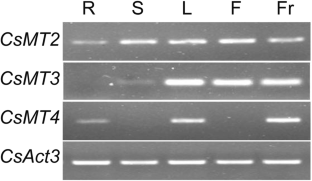 Fig. S1. Gene structures of the CsMT genes. The gene structures were determined by aligning the CDS sequences with the corresponding gDNA sequences with the GSDS server. UTRs (untranslated regions), CDSs, and introns showed by green rectangles, blue rectangles, and lines, respectively (TIFF 133 kb)