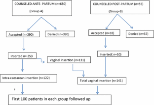 Both modes of PPIUCD insertion were found to have very low rates of expulsion, vaginal bleeding, infection, missing strings, and also effective as contraceptive. Expulsion rate was 4 % in the vaginal group and 2 % in intra-cesarean group. Strings of PPIUCD were less visible after cesarean insertion than vaginal insertion (p = 0.028).