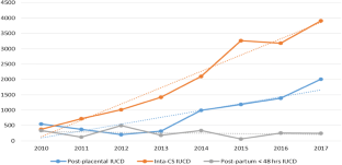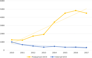 This study was a retrospective analytical study conducted at the Department of Obstetrics and Gynaecology in Safdarjung Hospital between the years 2010 and 2017. The number of IUCDs inserted post-placental (i.e. within 10 min of delivery of placenta) and within 48 h (of vaginal childbirth) and intra-caesarean (intrauterine insertion while performing caesarean) were recorded and analysed. Also, sterilizations (tubectomy) and interval IUCD insertions done during this time period were compared.