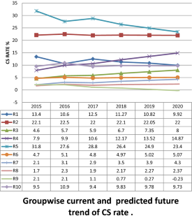 Increasing CS rate trend was seen over last 3 years with a predicted rise of 0.905% per year. Robson groups 5, 2 and 1 were at present major contributors; however, the trend analysis predicted a decreasing trend. Trend analysis predicted annual increment in groups 3, 4, 6, 7 and 8 over next 3 years, thereby suggesting need to focus on these groups as well.