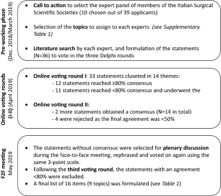A 3-step modified Delphi method was used to establish consensus. Ten representative members of the major Italian surgical scientific societies with proven colorectal expertise were selected after a call to action. After a comprehensive literature search, each expert drew a list of evidence-based statements which were voted in round one by the scientific board. Panel members were asked to mark “totally disagree”, “partially agree” or “totally agree” for each statement and provide comments. The same voting method was used for round 2. Round 3 consisted of a final face-to-face meeting.