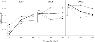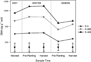 Severe powdery scab (caused by Spongospora subterranea) occurred in potato tubers harvested from a field trial, which measured effects of agronomic treatments (nitrogen fertiliser rates, irrigation intensities, previous crop rotations) on potato yields. Nitrogen application (400 kg N ha−1) increased weight of tubers per plant by 38 %. Incidence and/or severity of powdery scab were increased by nitrogen applications. Measurements of S. subterranea DNA in soil at harvest generally reflected the severity of powdery scab in harvested tubers. Amounts of DNA were greater after nitrogen application than without nitrogen fertiliser, less after “optimum” irrigation than “low” irrigation, and greater after a potato/wheat rotation than after potato/pea. The field trial area was used for two further growing seasons (without application of treatments) to determine if pre-planting measurements of Spongospora DNA in soil could predict powdery scab in harvested potatoes. The disease generally decreased during the next two growing seasons, and effects of the different agronomic treatments on powdery scab had disappeared by the second season. However, the greater amounts of pathogen DNA in soil in plots where nitrogen had been applied than where no fertiliser was used continued for the two following growing seasons. Relationships between amounts of pre-planting S. subterranea DNA in soil and powdery scab in subsequently harvested tubers were weak in the second growing season, and non-existent in the third. These results demonstrate that agronomic treatments (particularly nitrogen) can increase severity of powdery scab in harvested tubers. Furthermore, pre-planting measurements of pathogen DNA in soil did not give good predictions of the incidence or severity of powdery scab in harvested potatoes.