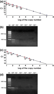 Cardamom being perennial, propagated vegetatively, detecting viruses in planting material is important to check the spread of viruses through infected material. Thus development of effective and sensitive assay for detection of viruses is need of the time. In this view, assay for the detection of Cardamom mosaic virus (CdMV) and Banana bract mosaic virus (BBrMV), infecting cardamom was developed using SYBR Green one step reverse transcription-quantitative PCR (RT-qPCR). The RT-qPCR assay amplified all isolates of CdMV and BBrMV tested but no amplification was obtained with RNA of healthy plants. Recombinant plasmids carrying target virus regions corresponding to both viruses were quantified, serially diluted and used as standards in qPCR to develop standard curve to enable quantification. When tenfold serial dilutions of the total RNAs from infected plants were tested through RT-qPCR, the detection limit of the assay was estimated to be 16 copies for CdMV and 10 copies for BBrMV, which was approximately 1,000-fold higher than the conventional RT-PCR. The RT-qPCR assay was validated by testing field samples collected from different cardamom growing regions of India. This is the first report of RT-qPCR assay for the detection of CdMV and BBrMV in cardamom.