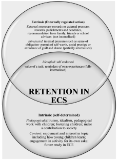 Currently, due to regulatory and prospective political reforms, Australian universities face an increased demand to supply quality early childhood teachers. While student attrition remains a general concern for all universities, this demand has presented a renewed focus on retention in Bachelor of Education (Early Childhood Studies [ECS]). The purpose of this study is to examine the experiences and motivations of preservice teachers, hypothesise the relation with attrition and determine gender differences. The data were gained from two sources. The first was from data held at a Western Australian university examining enrolment trends in ECS. Chi-square analysis revealed that male preservice teachers were significantly more likely to withdraw than their female counterparts. The second set of data were extracted from two independent qualitative studies on preservice teacher retention in the ECS course. Twenty-six preservice teachers participated in these studies and a total of 45 h of interviews were coded against indicators of extrinsic and intrinsic motivation. It was found that while female preservice teachers with either extrinsic or intrinsic motives could buffer stressful situations such as concentrated assessment periods, only males with intrinsic motives could do the same. This is in part, explained by the additional stressors males are confronted with, such as attitudinal factors and few male peers, which in turn places them at a higher risk of attrition.