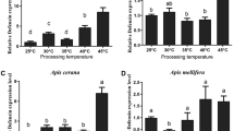 The selected reference genes were used as internal controls for the expression experiment with target genes. Raw data were obtained with the previous qPCR conditions and expression was analyzed using the delta-delta-CT (ΔΔCT) method (Livak and Schmittgen 2001) considering efficiencies correction. Every pool of three individuals per colony was treated as a biological replicate, and three biological and three technical replicates were used. GraphPad Prism version 5.00 software (GraphPad Software, San Diego, CA, USA, www.graphpad.com) was used for statistical analyses. An unpaired t test was performed with deltaCT mean values for every time point and gene to detect significant effects (p < 0.05) of the cold (9 °C) and heat (38 °C) treatments against the control (28 °C) treatment. Welch’s correction was applied when variances were significantly (p < 0.05) different.