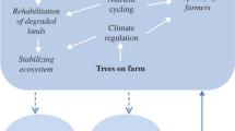 Our results showed also that cocoa trees can be grown in complex agroforestry systems while obtaining higher yields than those usually mentioned for agroforestry systems. The mean cocoa yield observed in Zima, higher than 1 t ha−1 (Table 1A), was obtained in agroforests where cocoa trees were grown with eight associated species at a density of 155 trees ha−1. In these cocoa agroforests, cocoa trees represented a relative basal area of 40%, while relative basal areas of forest trees and fruit trees were roughly of 40 and 20%, respectively. These results confirmed that trade-offs between cocoa tree density and associated tree density are possible to support a good level in cocoa production. They were in line with those obtained by Saj et al. (2017a) who found that very long-term sustainability could be achieved if the relative basal area of cocoa trees does not exceed 40%. These authors found also that some associated functional groups of woody species were consistently related to higher cocoa yield, highlighting that, in some cases, putative synergistic, or less damageable, effects on cocoa yields are successfully obtained by farmers. Finally, our results, and those of Saj et al. (2017b) who showed that cocoa agroforestry systems of central Cameroon are able to combine high levels of species richness with long-term conservation abilities and carbon storage, confirmed that trade-offs between cocoa yield and the growing of many species that contribute to the functioning of households (Cerda et al. 2014; Jagoret et al. 2014a) are possible.
