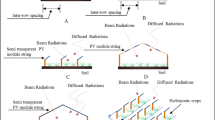 The extent of the reduction in solar radiation under an APV canopy very much depends on the seasonal solar altitude, the position underneath the array and the technical implementation of the facility. The latter includes orientation, tilt angle and size of the panels as well as the distance between them (Beck et al. 2012; Dupraz et al. 2011a). Due to the arrangement of the PV modules, shading underneath the facility is not uniform and varies during the day depending on solar altitude. In studies with APV systems adapted for crop production, for example through a reduced module density, crop-available radiation was predicted to reach values ranging between 60 and 85% of that in open-field conditions (Dupraz et al. 2011a; Majumdar and Pasqualetti 2018; Obergfell et al. 2017; Praderio and Perego 2017). This effect will be less distinct in smaller APV facilities due to border effects, especially when the sun is low and can reach the ground from the sides. In a field experiment where different lettuce varieties were cultivated under an APV facility, Marrou et al. (2013c) found that with reduced PV module density with a panel row distance of 3.2 m, up to 73% of incoming radiation was available at plant level. On average, the lettuce yields were 81–99% of the full-sun control yields, with two varieties even exceeding the control values. In simulations performed with climate data from the last 37 years (1975–2012), Praderio and Perego (2017) found that average yields of maize and wheat grown under APV would only be reduced by about 0.5–1.5%. However, it remains doubtful whether such yields can be achieved in practice. In a modified crop model adapted to the shading conditions underneath APV, Homma et al. (2016) found a 20% reduction in solar radiation led to a 20% reduction in rice yields. They concluded that sufficient light availability during early growth periods is an important yield factor.
