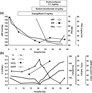 Dapagliflozin (DAPA), a sodium–glucose co-transporter 2 (SGLT2) inhibitor, is known to have a beneficial diuretic effect, in addition to a glucose-lowering effect. Although SGLT2 inhibitor has been reported, the increase of hyperkalemia in patients treated with renin–angiotensin–aldosterone system (RAAS) inhibitors, their mechanism of action is unclear. We report the first case of a type 2 diabetes (T2DM) patient with potential mineralocorticoid deficiency who developed hyperkalemia after administration of DAPA. A 79-year-old woman underwent bilateral adrenalectomy for uncontrolled hypercortisolism due to an inoperable recurrence of Cushing’s disease, and she was subsequently maintained on replacement therapy with glucocorticoid. She was diagnosed as having T2DM at 71 years of age and was treated with sitagliptin and miglitol. Since she presented with weight gain of about 5 kg over 6 months and her HbAlc level increased over 12%, 5 mg/day DAPA was added to her daily regimen. After the start of DAPA treatment, she developed hyperkalemia (6.5 mEq/L) with increased plasma renin activity of 53.1 ng/mL/h. She was diagnosed with aldosterone deficiency and started on fludrocortisone 0.1 mg daily, after which the hyperkalemia improved immediately. In this case, DAPA treatment could potentially increase the requirement for mineralocorticoid replacement, directly suggesting that the SGLT2 inhibition-induced natriuretic effect is accompanied by compensatory activation of the RAAS axis, which is essential to keep the serum potassium level within the normal range. Therefore, physicians should be careful about the development of hyperkalemia in patients when SGLT2 and RAAS inhibitors are used in combination.