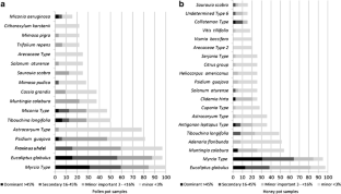 Melipona eburnea Friese is a stingless bee kept in some regions of Colombia, where it is reported to be vulnerable to extinction due to habitat disturbance. To contribute to raising conservation strategies, the aim of this study was to identify the floral preferences of this species using melissopalynological analysis. A total of 31 pollen pot samples and 37 honey samples were taken from March 2009 through March 2010 from four colonies in Fusagasuga, Colombia. We found 92 pollen types: 17 from pollen pot samples, 39 from honey samples (indicating the sources of nectar), and 36 in both types of samples. The most frequent pollen types in the pollen pot samples were Myrcia type (100%), Eucalyptus globulus (96.9%), and Fraxinus uhdei (96.9%). The most frequent pollen types in honey samples were E. globulus (97.4%) and Myrcia type (94.9%). The pollen types corresponded mainly to native plants (68%), trees (44.5%), plants whose sexual system is hermaphroditic (56.5%), and plants with inflorescences (76.2%). The most frequent shapes of the flowers were brush-like (type Myrtaceae) and dish-like (type Asteraceae), and the preferred flower colors were white or cream (52.2%). In general, we found that M. eburnea showed a strong preference for trees of the family Myrtaceae to obtain nectar and pollen, including native and introduced species. Some other families are contributing significantly, such as Melastomataceae for pollen collection and Asteraceae for nectar. These results highlight the key plant species for the diet of M. eburnea.