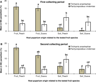 da Costa OD, Stupp P, Martins LN, Wollmann J, Geisler FCS, Cardoso TDN, Bernardi D, Garcia FRM (2021) Interspecific competition in Trichopria anastrephae parasitism (Hymenoptera: Diapriidae) and Pachycrepoideus vindemmiae (Hymenoptera: Pteromalidae) parasitism on pupae of Drosophila suzukii (Diptera: Drosophilidae). Phytoparasitica 49:207–215. https://doi.org/10.1007/s12600-020-00843-2
