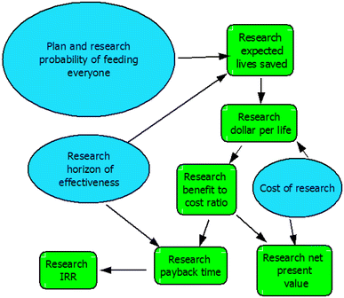 This allows the model to find a benefit to cost ratio; the model conservatively ignores benefits other than lives saved, such as lower food prices for people who would have survived anyway. The total benefit minus the cost yields the net present value (NPV). The payback time is the number of years after the project has been completed for the expected benefit to pay back the cost. Since the payback times are short, a good approximation of the internal rate of return (IRR) is the reciprocal of the payback time (Pearce et al. 2009).
