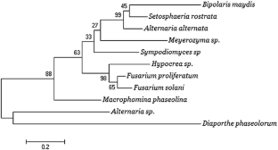 In a quest to find remedy against chemical fungicides, a tropical medicinal plant Chlorophytum borivilianum Sant and Fern., was selected for exploring diversity of endophytic fungal community and their biocontrol potential towards phytopathogens Botrytis cinerea, Fusarium oxysporum, Sclerotinia sclerotiorum and Rhizoctonia solani. From 209 leaf tissues of C. borivilianum brought from Delhi and Hyderabad, 51 endophytic fungal isolates were attained. Sequence analysis of PCR amplified rDNA ITS region grouped these endophytic fungal isolates into 12 genera. The most frequent species was Fusarium proliferatum (17.6%). Shannon diversity index (\({\text{H}}^{{\prime }}\)) was found to be higher in Delhi (1.850) than Hyderabad (0.693) in 2010. Previously unknown as endophytes, plant pathogenic fungi Rhizoctonia bataticola and Setosphaeria rostrata have been reported from C. borivilianum. Bipolaris maydis, Diaporthe phaseolorum, Fusarium solani, Macrophomina phaseolina and R. bataticola were recovered from Delhi during first collection as deduced by principal component analysis. About 9.8% of endophytic fungal isolates exhibited anti-plant pathogenic fungi. F. proliferatum recovered from Delhi in 2011 displayed highly effective antifungal activity against all phytopathogens with IC50 value ranging from 0.527 to 2.119 mg/ml.
