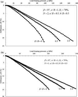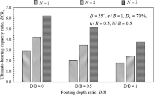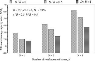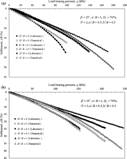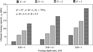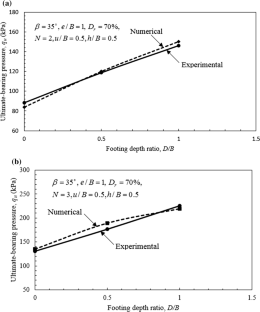This paper presents the results of laboratory model tests and numerical analysis on the behaviour of a strip footing embedded in a multilayer geotextile-reinforced sand slope. The investigation was aimed at determining the effect of footing embedment depth \( D \) and number of geotextile layers \( N \) on the bearing capacity and settlement characteristics of an embedded footing. The results show that the load–settlement behaviour of the embedded footing is significantly affected by \( D \) and \( N \). The advantage of reinforcing the slope with more than one geotextile layer and placing the footing below the slope crest has been evaluated using a non-dimensional parameter, called the ultimate bearing capacity ratio \( {\text{BCR}}_{u} \), defined as the ratio of ultimate bearing capacity of the reinforced case to that of unreinforced case. It is observed that \( {\text{BCR}}_{u} \) improves with an increase in \( N \) but reduces with an increase in \( D/B \), where \( B \) is the footing width. The minimum \( {\text{BCR}}_{u} \), \( {\text{BCR}}_{u} (\hbox{min} ) \approx 2 \) is observed for \( N = 1 \) and \( D/B = 1 \), while the maximum \( {\text{BCR}}_{u} \), \( {\text{BCR}}_{u} (\hbox{max} ) \approx 6 \) is attained when the footing is placed at \( D/B = 0 \) and \( N = 3 \). A comparison between the numerical and laboratory test results shows a very good agreement.